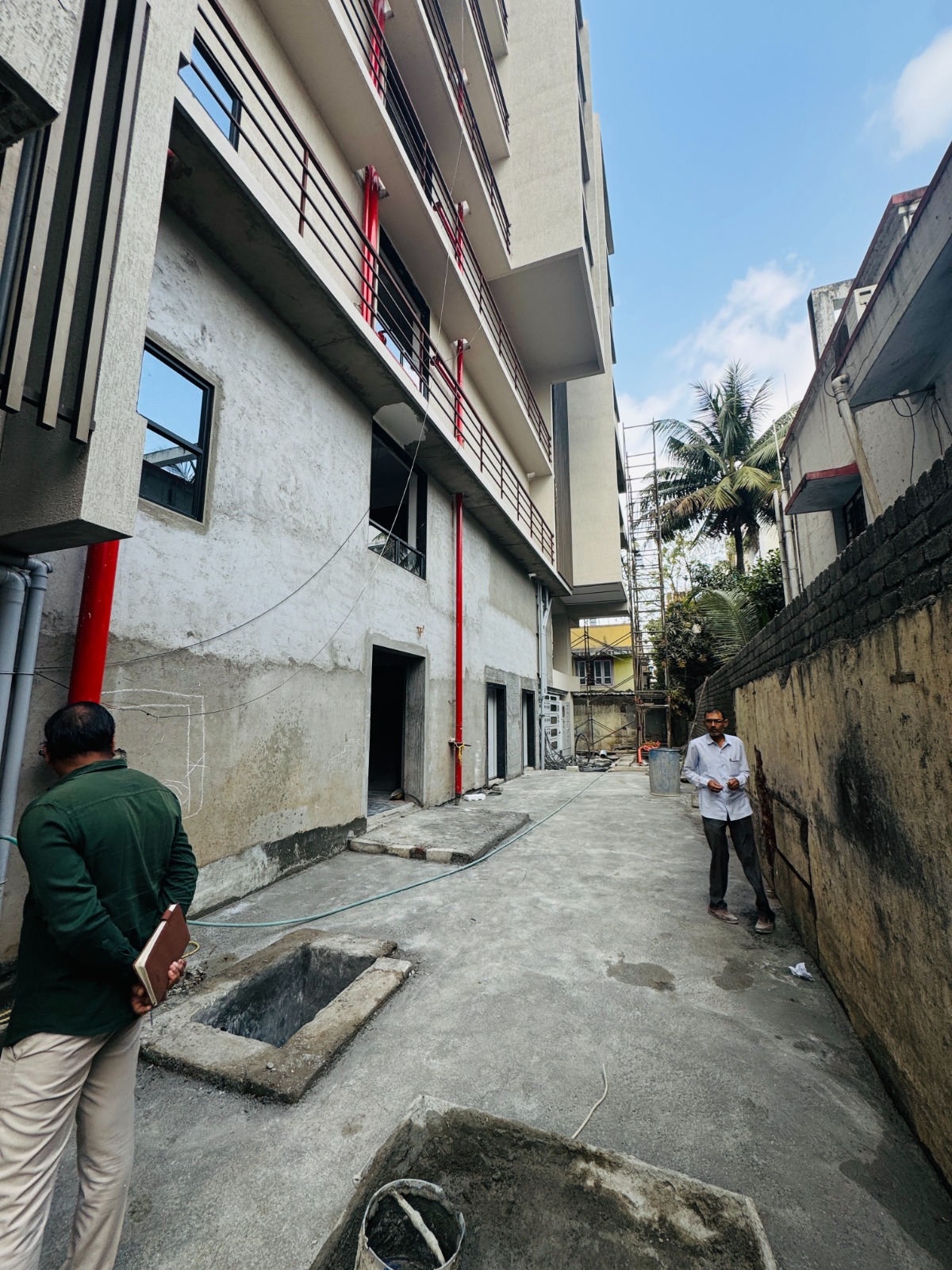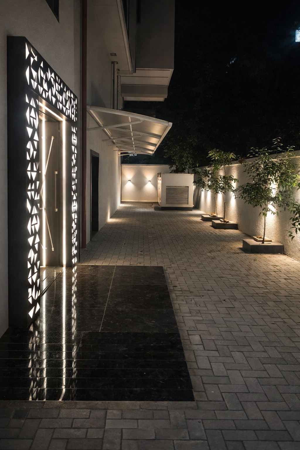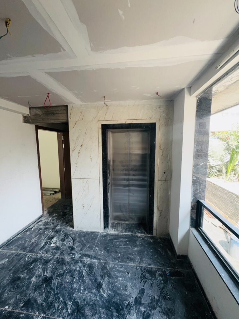 Our scope included the design of the main lobby, typical floor lobbies, staircase, entrance, elevator cladding, selected portions of the façade, and the approach road to the building. Enhancing the overall building experience was the key intent. The narrow road entry had to be carefully managed alongside a dilapidated neighbouring wall,