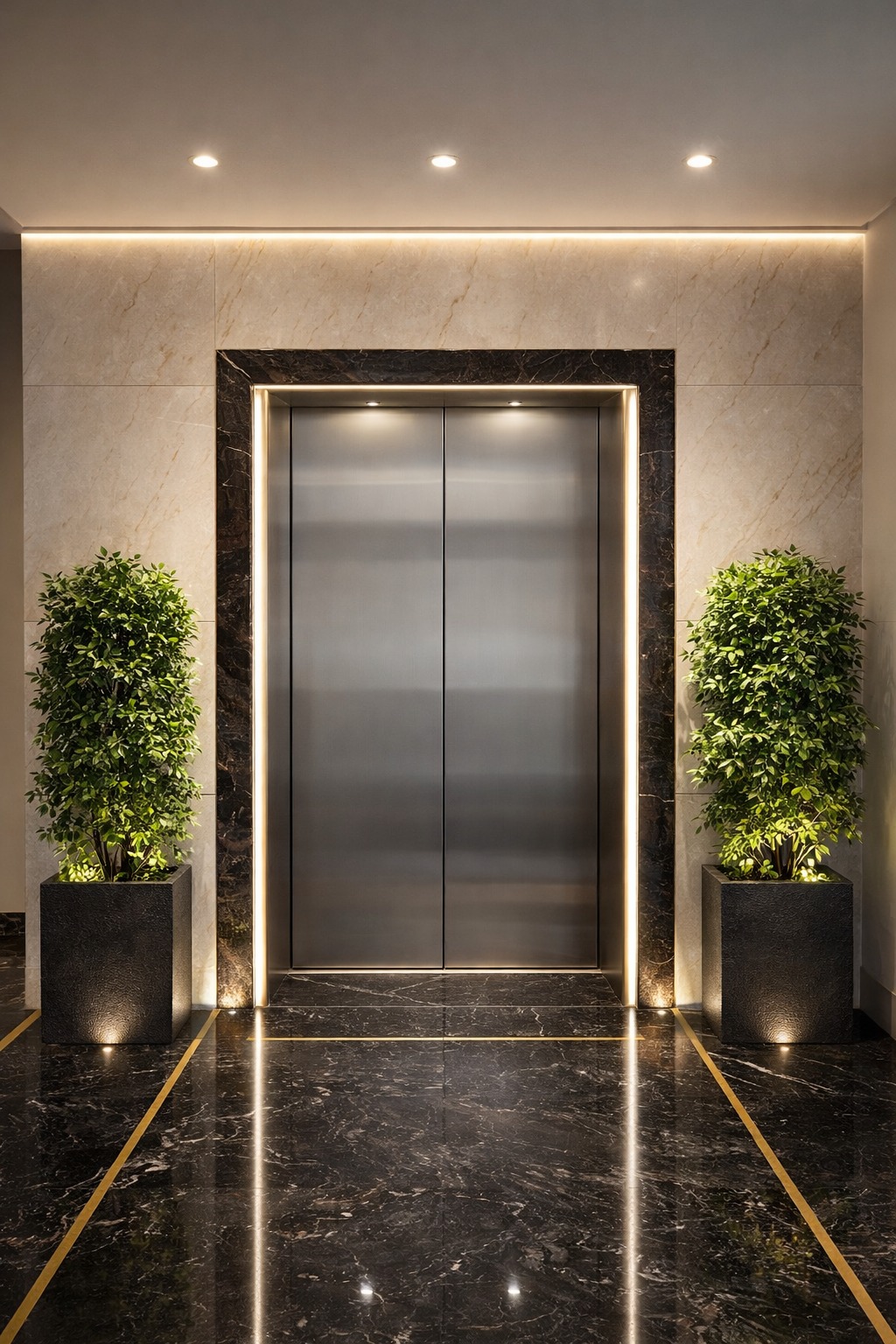 Although the typical lobbies were compact, being a commercial building, they needed to feel welcoming and well-designed. The main lobby, despite its limited size, had to accommodate branding and name placards while maintaining a luxurious and professional look. Services and pipes were thoughtfully concealed yet kept accessible, ensuring functionality without compromising aesthetics.
