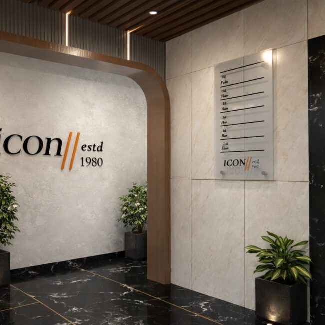 We had the opportunity to design a commercial building called Icon Business Bay for the ICON Group in Baner, Pune. While the building had the right spatial planning, it required a classy, refined identity to elevate its overall presence.